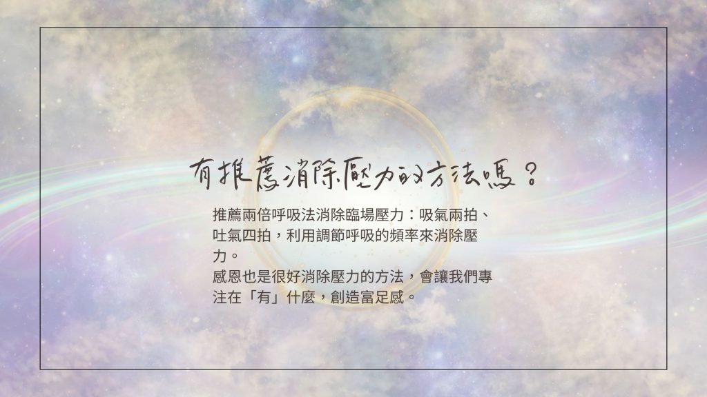 兩倍呼吸法可以隨時進行,只要我們發現自己身體開始緊繃時,無論是在講電話、開會或是上台前,都可以進行。