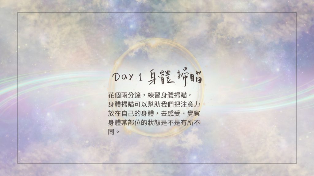 身體掃瞄可以幫助我們把注意力放在自己的身體,去感受、覺察身體某部位的狀態是不是有所不同。