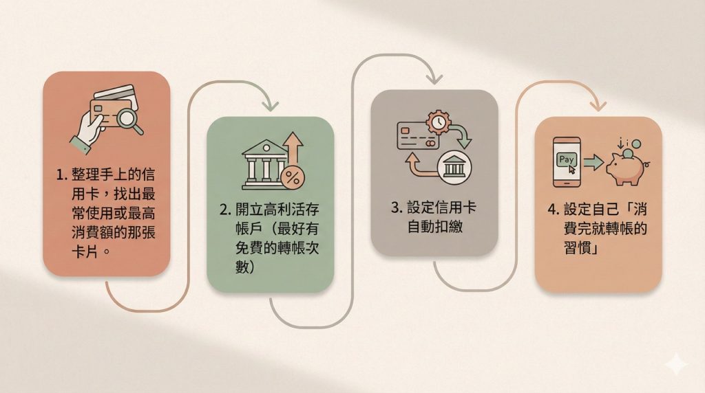 找到最常使用的信用卡後,可以優先查詢該銀行是否有高利活存帳戶,兩者連動起來是最方便的。